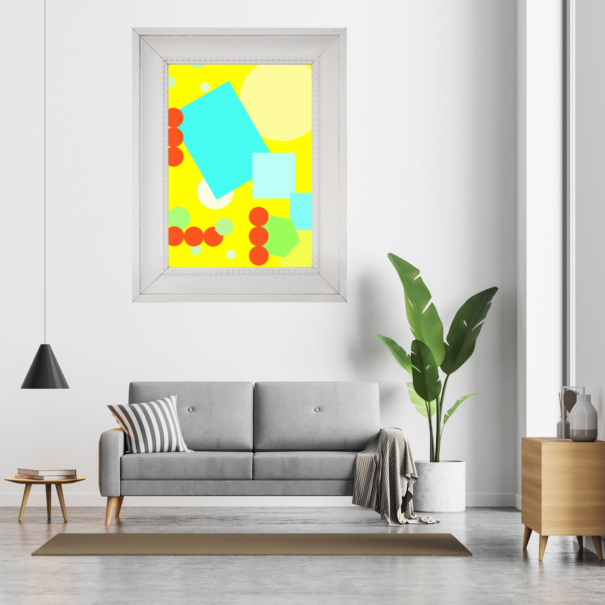 Product Description: Geometric shapes of different colors in a yellow background.
