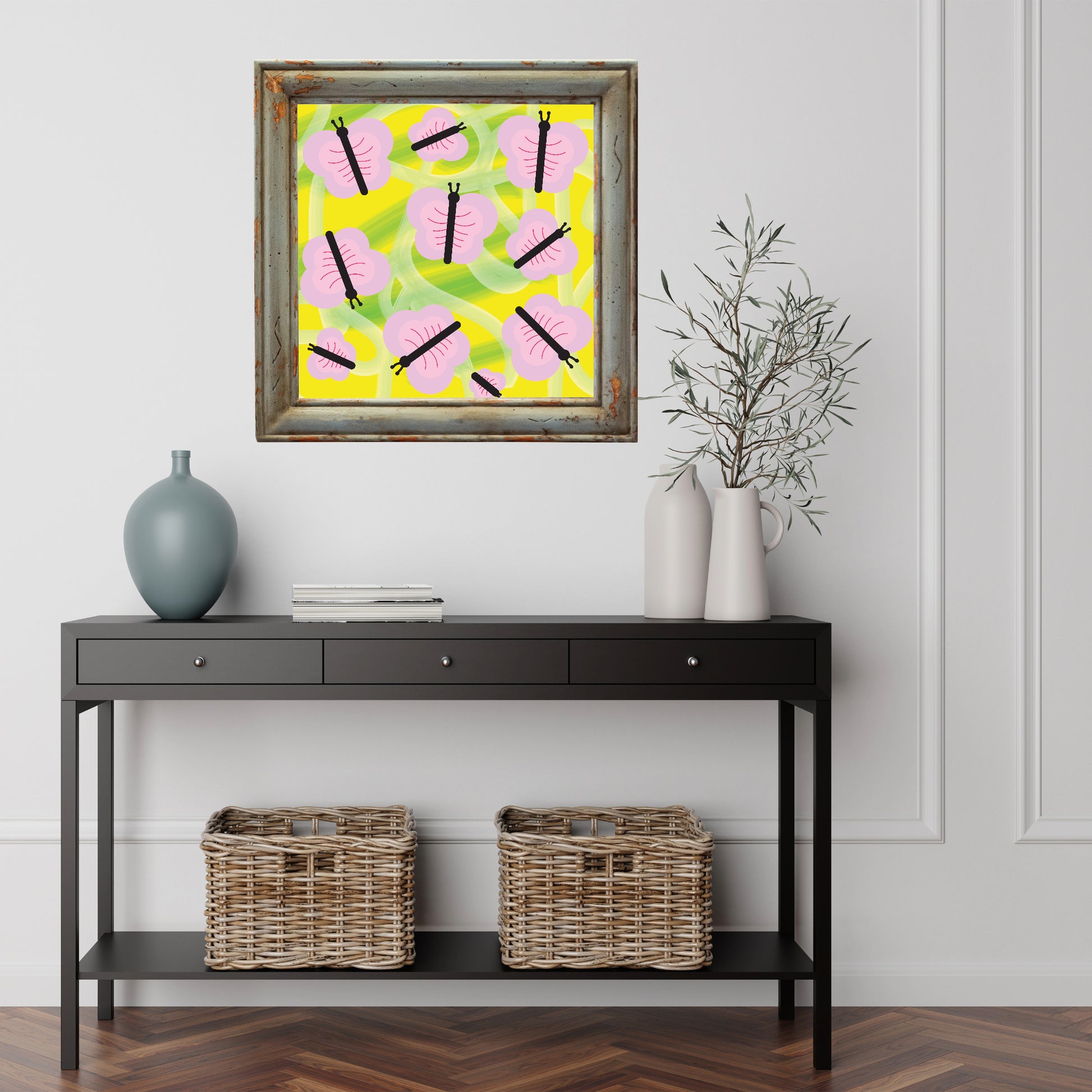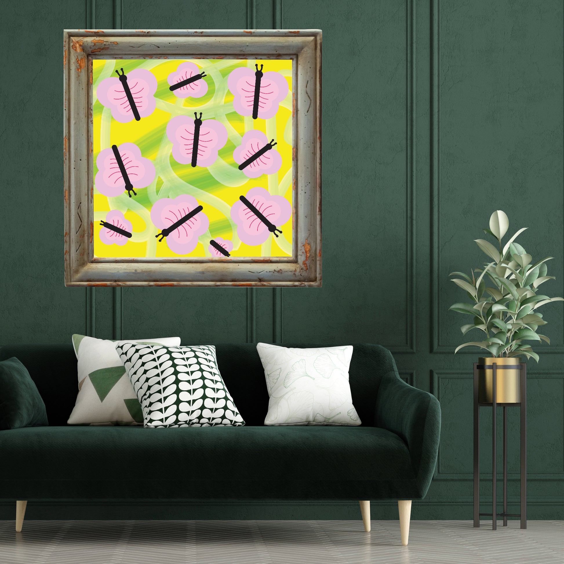 Product Description: Abstract pink butterflies placed around flat with a yellow and green background