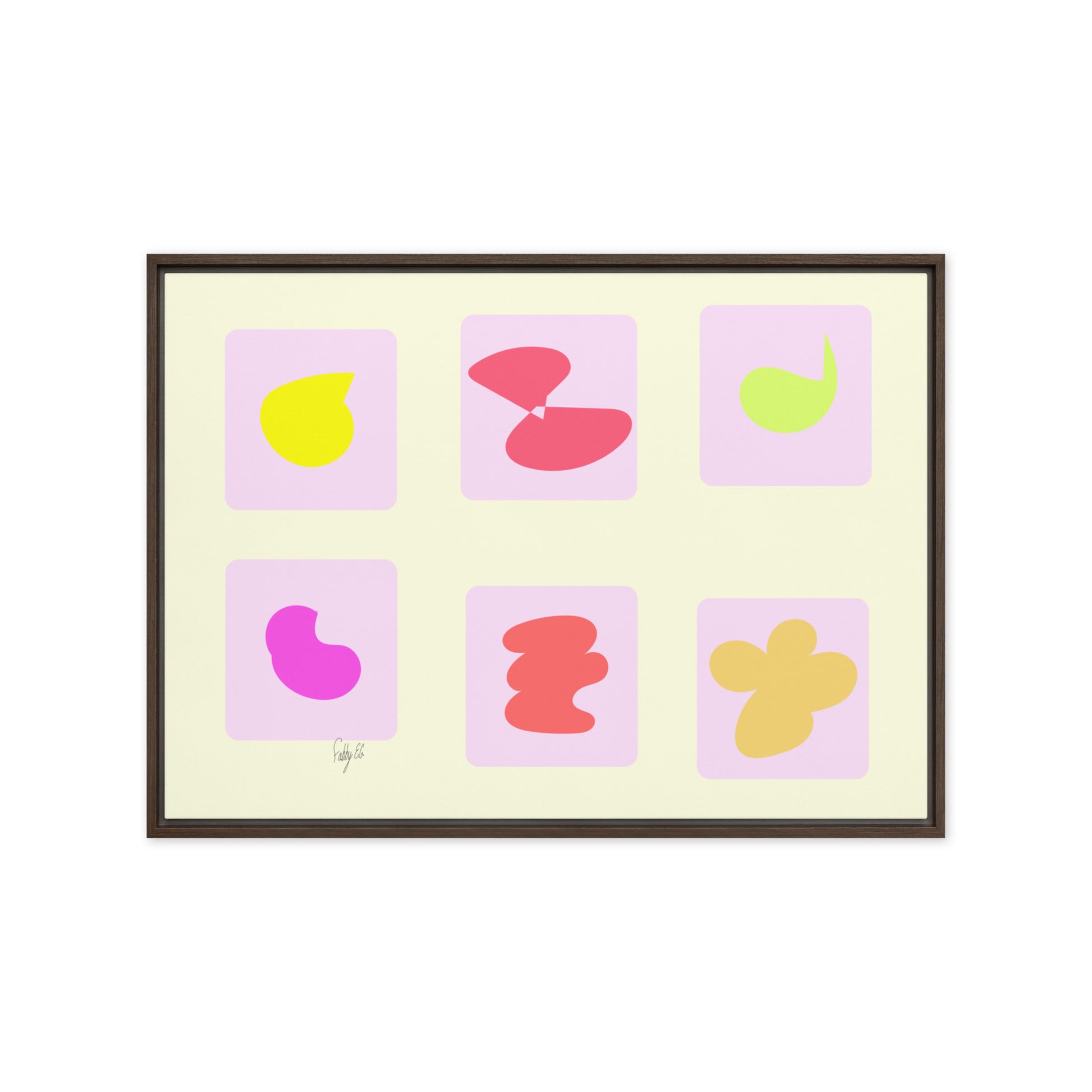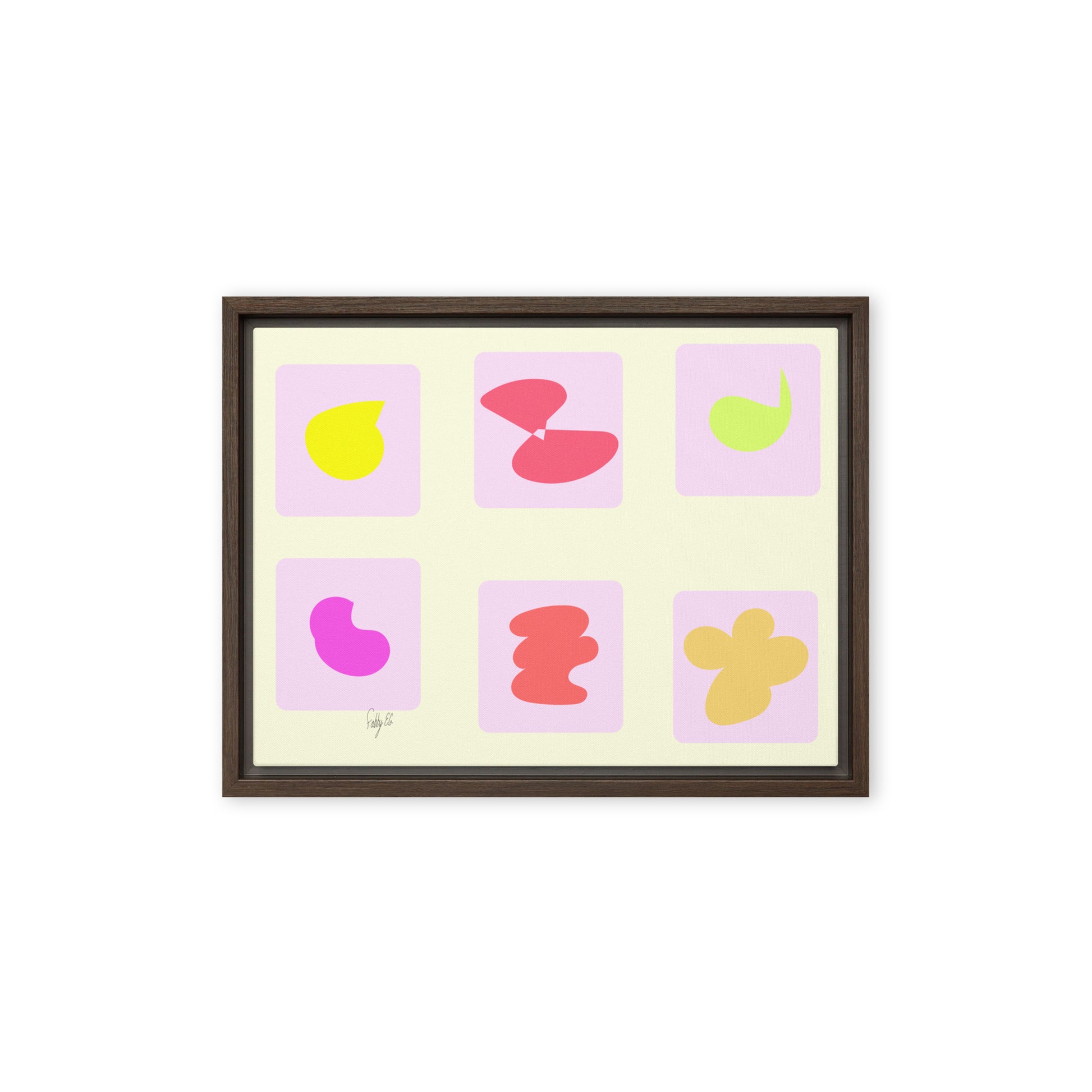 - The framed canvases with brown and black frames have a black inside around the canvas, and the canvases with white frames have a white inside around the canvas.